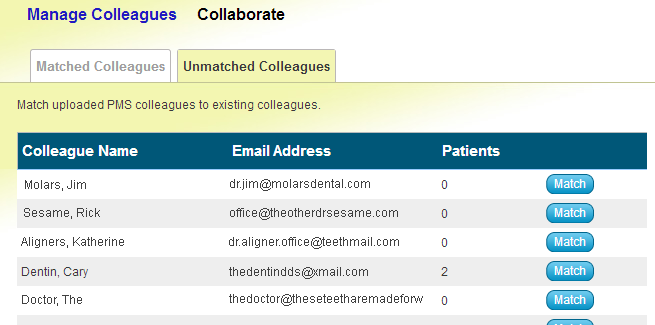 Your Unmatched Colleagues page will contain a list of all your colleagues that have not yet been assigned a Doctor Login account. The Colleague Name and Email Address are entered into Sesame when we receive this information from your practice management system. The Patients column shows you how many times that colleague appears as a patient’s doctor in your database.